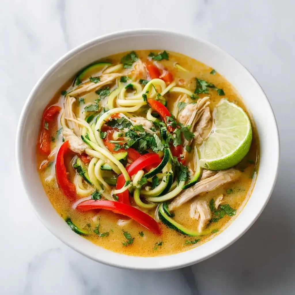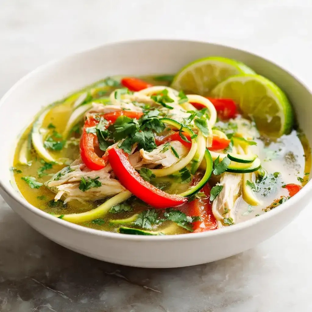 This dish blends Thai-inspired aromatics with an ultra-simple method. The coconut milk adds richness while the lime and cilantro keep it fresh and vibrant. Because the zucchini noodles are added raw to each bowl, they maintain a pleasant bite instead of turning mushy. The entire soup cooks in one pot, and the chicken is cut thin so it cooks in minutes. If you enjoy meals that feel light yet satisfying, this soup becomes a weeknight staple fast.